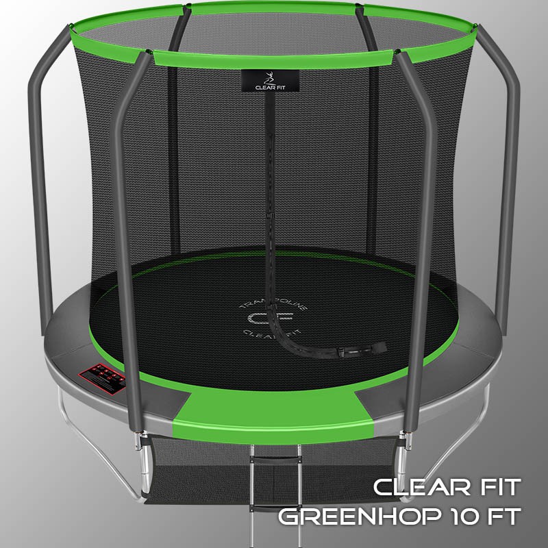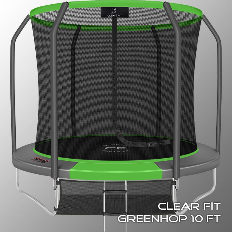 В 2026 году представлена обновленная линейка с улучшенной конструкцией каркаса. Усиление достигнуто за счет использования прочных Т-образных кронштейнов из металла толщиной 1.9 мм. Кроме того, в комплектацию добавлен карман для обуви. Каркасный батут с защитной сеткой Clear Fit серии GreenHop — отличаются комфортом и надежностью. Надежная рама из качественных комплектующих, прочная защитная сеть снабжена прямым креплением к прыжковому полотну и дополнительной защитой входа, наверху каркасное жесткое крепление, сеть не провисает и не слетает во время тренировок. Увлекательный, полезный и безопасный тренажер для всей семьи. Батуты серии GreenHop 10Ft, 12Ft, 14Ft и 16Ft поставляются в оптимальной для комфорта и безопасности комплектации: батут, верхняя защитная сеть, защитный мат, лестница и карман для обуви. Благодаря размеру батута в 10 футов и диаметру прыжковой поверхности 2.62 м он идеально подходит для дачного участка, размеры полотна позволяют комфортно тренироваться взрослым и развлекаться детям любого возраста. Верхняя защитная сеть оберегает от падений, усиленная молния и дополнительная защита входа уберегут малышей от случайного входа или падения. Надежный каркас из оцинкованной стали, качественные комплектующие и погодостойкие гальванизированные метизы рамы делают батут безопасным, устойчивым, надежным, гарантируют полную защиту от коррозии и долгий срок службы. Максимальный вес пользователя батута GreenHop 10Ft — до 170 кг.