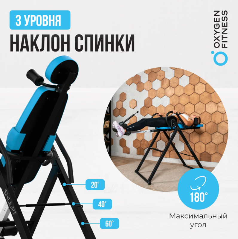 Инверсионный стол SKULPT от OXYGEN FITNESS — это высокоэффективное оборудование, которое поддерживает здоровье позвоночника и помогает улучшить общее самочувствие. Основной принцип работы устройства заключается в использовании инверсионной терапии, которая снимает напряжение в позвоночнике, улучшает кровообращение и снижает давление на межпозвоночные диски, что особенно полезно для тех, кто страдает от болей в спине или ведёт малоподвижный образ жизни. Стол SKULPT обеспечивает высокую точность настройки под каждого пользователя: 14 уровней регулировки спинки, 3 варианта угла наклона до 180 градусов и 8 уровней фиксации ног. Это позволяет эффективно и безопасно использовать его людям с разными физическими параметрами, поддерживая рост до 200 см и вес до 130 кг. Такая гибкость настроек делает его отличным выбором как для домашних пользователей, так и для реабилитационных центров. Инверсионная терапия доказала свою эффективность в улучшении гибкости позвоночника и снятии мышечного напряжения. Регулярное использование стола способствует улучшению осанки, уменьшению болей в спине и восстановлению нормального кровотока, что также помогает улучшить работу внутренних органов. Кроме того, инверсии помогают предотвратить варикозное расширение вен и укрепить суставы. Для удобства пользователя в конструкции стола предусмотрены удобные подушки: спинка имеет толщину 3,5 см, а подголовник — 2,7 см, что обеспечивает дополнительную поддержку и комфорт во время сеансов. Надежные фиксаторы для ног и мягкие валики исключают риск травм или дискомфорта даже при длительном использовании. Инверсионный стол SKULPT отличается прочной и легкой конструкцией, что делает его идеальным выбором для тех, кто ценит комфорт, безопасность и компактное хранение. В сложенном состоянии стол занимает минимум места, что позволяет легко хранить его даже в небольших помещениях. Если у вас есть патологии или заболевания опорно-двигательного аппарата, перед использованием необходима консультация врача.