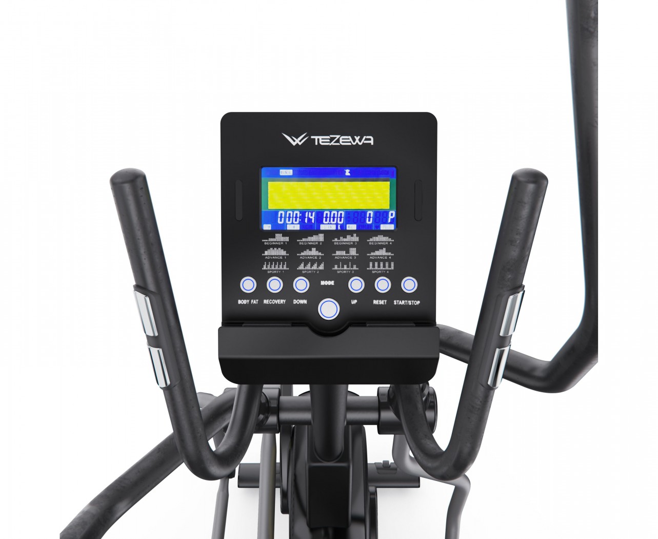 На встроенном LCD-дисплее с синей подсветкой отображаются все важные параметры тренировки: время, скорость, дистанция, калории, пульс (сенсорные датчики на поручнях), обороты в минуту (RPM), а также мощность в ваттах и выбранную программу. В тренажёре уже запрограммировано 12 тренировочных режимов, что делает занятия более разнообразными и результативными.