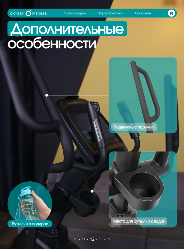 OXYGEN FITNESS AZURE — высокотехнологичный эллиптический тренажёр для домашних тренировок продвинутого уровня. Модель ориентирована на пользователей, которым важна длина шага, точная настройка нагрузки, работа по пульсу и расширенная аналитика тренировки. AZURE сочетает в себе эргономику клубного оборудования и функциональность, адаптированную для комфортного использования дома. Тренажёр построен на высокопрочной раме с антикоррозийной обработкой и двухслойной покраской, что обеспечивает устойчивость и долговечность конструкции. Корпус выполнен из ударопрочного полистирола HIPS, рассчитанного на длительную эксплуатацию. Ключевые особенности движения: • Инерционный вес маховика 30 кг (BioFusion™) при реальном весе 10 кг — ровный, стабильный и тихий ход. • Длина шага 540 мм — максимально естественная траектория, близкая к беговой, подходит пользователям разного роста. • Минимальное расстояние между педалями — 70 мм, что снижает нагрузку на колени и тазобедренные суставы. • Дисковый шатун — повышенная надёжность и точность передачи усилия. • Ручная регулировка угла наклона (3 уровня) позволяет смещать акцент нагрузки и разнообразить тренировочный процесс. Антискользящие педали увеличенного размера обеспечивают уверенную фиксацию стопы даже при интенсивной работе. AZURE использует электромагнитную систему нагружения с 16 уровнями сопротивления, регулируемыми электронно. Это обеспечивает точную и плавную настройку нагрузки под любые цели — от восстановительных тренировок до интенсивной кардиоработы. Тренажёр оснащён современной TFT-консолью с расширенным набором показателей: • время, скорость, дистанция, • калории, пульс, уровень нагрузки, • программа, Ватты, количество шагов, • общая дистанция. Программный пакет включает 21 режим тренировки: • быстрый старт и ручной режим, • 12 предустановленных программ, • 4 пульсозависимые программы, • 1 программа целевого пульса, • режим работы по Ваттам. Для контроля пульса предусмотрены сенсорные датчики на поручнях. Рукоятки двухпозиционные, с нескользящим покрытием. Дополнительные возможности: • Bluetooth-колонка для воспроизведения аудио, • подключение к интернету, • функция проекции экрана, • подставка под планшет или смартфон, • интерфейс на английском языке. OXYGEN FITNESS AZURE — эллиптический тренажёр для тех, кто хочет получить максимум от домашних кардиотренировок: продвинутую биомеханику, интеллектуальные программы и уровень комфорта, сравнимый с профессиональным фитнес-клубом.