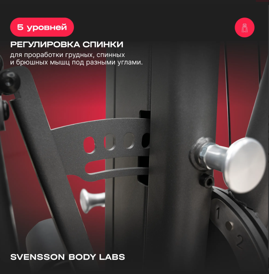SVENSSON BODY LABS RIGEL PRO — это полукоммерческий силовой комплекс, предназначенный для эффективных тренировок всех групп мышц. Благодаря продуманной конструкции и широкому функционалу, он идеально подходит как для фитнес-центров, так и для тех, кто ценит качество и комфорт в домашних тренировках. Высокое качество материалов и продуманный дизайн обеспечивают долговечность и надежность оборудования. Комплекс оснащен грузоблочным стеком весом 60 кг, состоящим из 12 стальных плит по 5 кг каждая, что позволяет регулировать нагрузку до 90 кг. Регулировка положения сиденья, спинки и тяговых элементов осуществляется по нескольким уровням (до 7 для тяги, 5 для спинки, 4 для сиденья по высоте), обеспечивая комфорт и индивидуальную настройку под каждого пользователя. Эргономичное сиденье с наполнителем из PU-поролона и обивкой из искусственной кожи гарантирует комфорт во время тренировки. Общий размер комплекса в рабочем состоянии составляет 190 см в длину, 130 см в ширину и 210 см в высоту. Максимальная допустимая нагрузка для пользователя — 140 кг, что делает комплекс универсальным для большинства спортсменов. Подушки и валики выполнены из искусственной кожи и имеют размеры: спинка — 45.5х36х5.5 см, сиденье — 45.5х34х5.5 см, диаметр валика - 11 см, что обеспечивает комфорт и поддержку при выполнении различных упражнений. SVENSSON BODY LABS RIGEL PRO — идеальный выбор для эффективных и безопасных тренировок в условиях полукоммерческого использования. Ключевые преимущества SVENSSON BODY LABS RIGEL PRO: • многофункциональность: возможность выполнять упражнения на все группы мышц; • надежность и качество материалов: стальной трос и прочный грузоблочный стек; • регулируемость и комфорт: многоуровневая настройка сиденья, спинки и тяговых элементов;