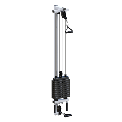 Изменение нагрузки осуществляется при помощи металлической иглы-фиксатора, что позволяет быстро адаптировать тренажёр под конкретное упражнение. Передача усилия происходит через трос диаметром 5 мм в ПВХ-оплётке с усилием на разрыв 500 кг, при этом максимальная допустимая нагрузка системы достигает 800 кг. Вращение узлов реализовано на подшипниках качения закрытого типа, а блоки работают на основе скользящей посадки оси во втулке, что положительно сказывается на ресурсе оборудования.