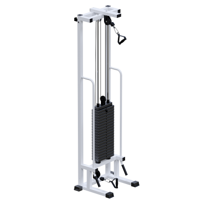 Грузоблочный стек состоит из металлических обрезиненных плит по 5 кг с хромированными направляющими. Регулировка нагрузки осуществляется при помощи металлической иглы-фиксатора. Передача усилия реализована через трос диаметром 5 мм в ПВХ-оплётке с разрывным усилием 500 кг и допустимой рабочей нагрузкой до 800 кг, что обеспечивает высокий запас надёжности.