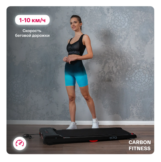 Беговая дорожка CARBON FITNESS T170 — это идеальное решение для домашних тренировок, предлагающее сочетание функциональности и удобства. С ее помощью вы сможете поддерживать физическую форму, не выходя из дома. Компактные размеры и легкий вес (всего 20 кг) позволяют без труда перемещать и хранить дорожку, что делает ее отличным выбором для квартир с ограниченным пространством. Электрическая беговая дорожка оснащена надежным двигателем LEESON Electric Corporation мощностью 1,5 л.с. и пиковым показателем 2,5 л.с., что обеспечивает плавный разгон скорости от 1 до 10 км/ч. Беговое полотно выполнено из МДФ с парафинированной декой толщиной 12 мм, что обеспечивает комфортные условия для тренировок. LED-дисплей с белой индикацией отображает ключевые параметры: время, скорость, дистанцию и количество сожженных калорий. Беговая дорожка T170 поддерживает Bluetooth для работы с мобильными приложениями Spax™ и Kinomap™, что позволяет разнообразить ваши тренировки и отслеживать прогресс. Пульт дистанционного управления обеспечивает дополнительное удобство, позволяя вам легко регулировать параметры тренировки. Также предусмотрен ручной режим для тех, кто предпочитает самостоятельно настраивать свои занятия. Беговая дорожка CARBON FITNESS T170 — это стильный и эффективный помощник на пути к вашему здоровью и отличной физической форме. Ключевые преимущества CARBON FITNESS T170: • скорость от 1 до 10 км/ч для удобства тренировок; • компактные размеры и легкий вес (20 кг) для удобного хранения и транспортировки; • LED-дисплей с белой индикацией для легкого считывания данных; • поддержка мобильных приложений через Bluetooth для интерактивных тренировок; • максимальный вес пользователя до 100 кг, что делает дорожку подходящей для различных пользователей.