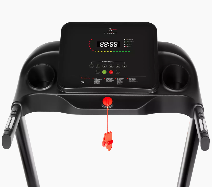 Панель управления полностью русифицирована, LСD дисплей 3.43” отображает все ключевые параметры тренировки: время, скорость, дистанция, калории и пульс. Консоль отличается простой, удобной системой навигации на русском языке, современным и лаконичным дизайном. Оптимальный пакет программ повышает эффективность тренировок, помогает сохранить мотивацию и интерес к занятиям: 17 разноплановых тренировок, аэробные, целевые программы и тест программу BodyFat. На поручнях расположены датчики пульса и клавиши быстрого доступа для регулировки скорости.